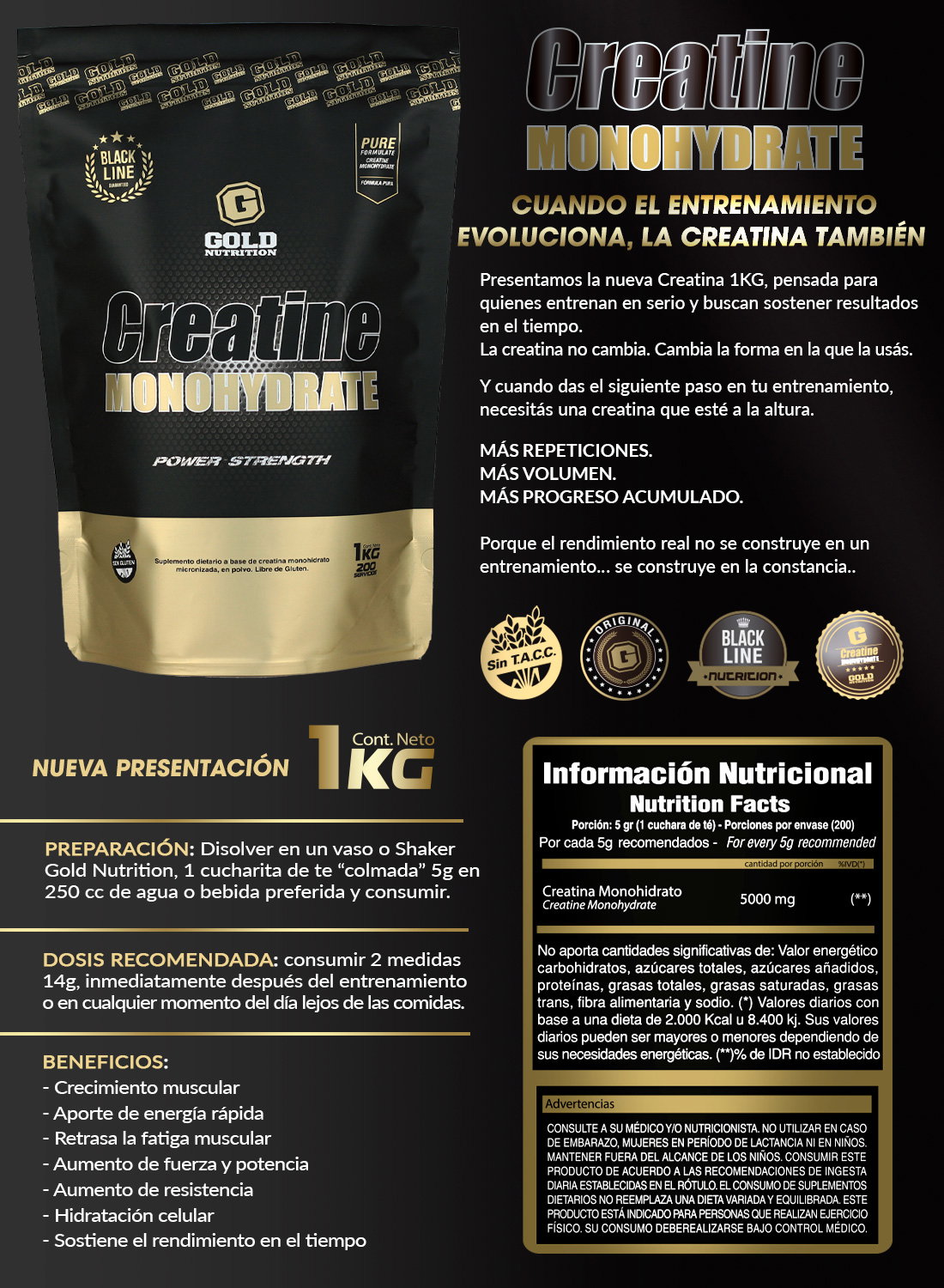 La Creatina de Gold Nutrition es un suplemento en polvo de alta pureza, diseñado para mejorar el rendimiento físico, aumentar la fuerza y potenciar el crecimiento muscular. La creatina es un compuesto natural presente en el cuerpo que ayuda a regenerar el ATP, la principal fuente de energía muscular durante el ejercicio intenso.