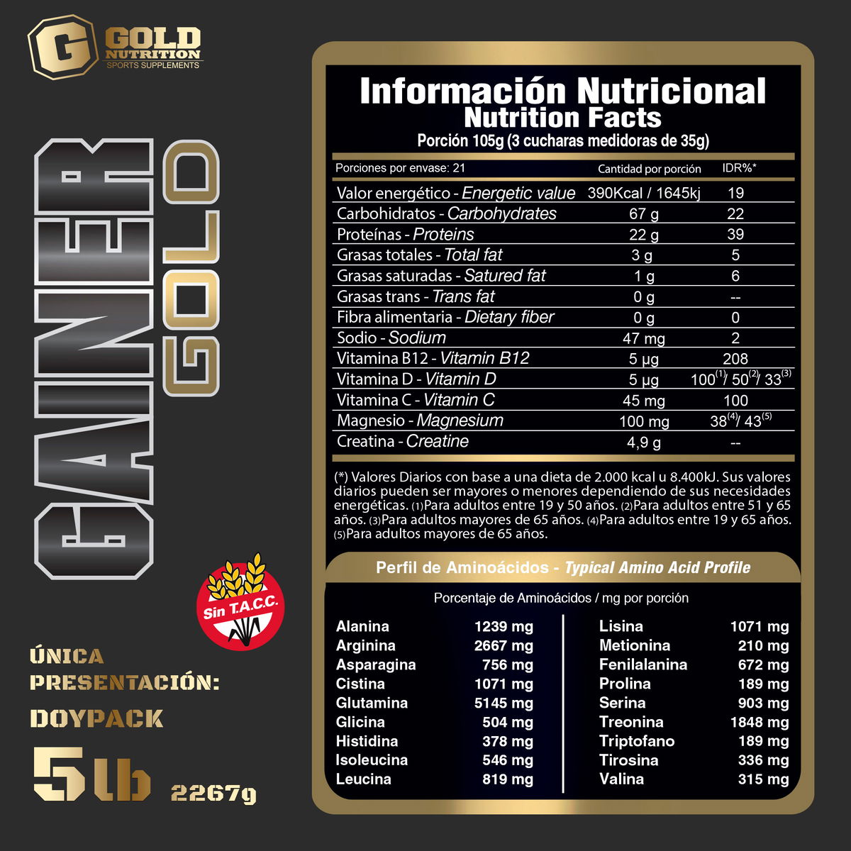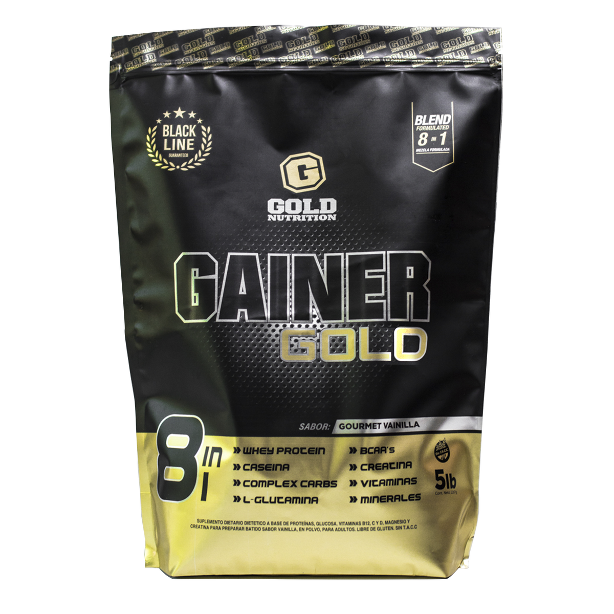 Gainer Gold es un suplemento nutricional tipo "mass gainer", formulado para incrementar masa muscular y ofrecer recuperación óptima tras entrenamientos intensos. Su fórmula patentada 8 en 1 incluye proteína concentrada de suero, caseína, carbohidratos complejos, creatina monohidrato, glutamina, BCAA’s, vitaminas y minerales, todo en una presentación libre de gluten y sin TACC.