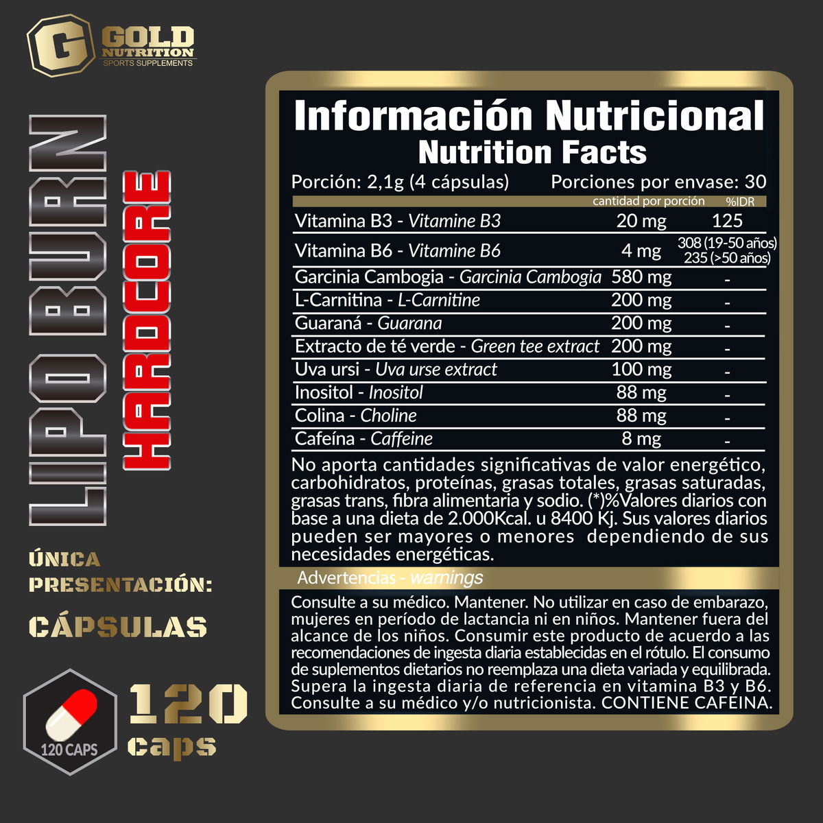 Lipo Burn Hardcore de Gold Nutrition es un termogénico en cápsulas (120 unidades) con fórmula renovada, sin cafeína añadida, expresamente diseñada para estimular la quema de grasa corporal y mejorar el rendimiento físico mediante ingredientes naturales.