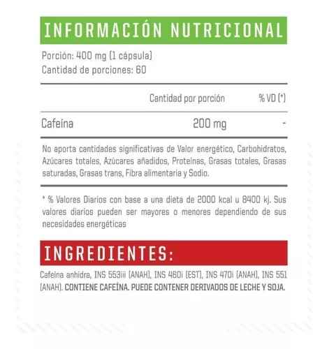 Concentra 200 mg de cafeína anhidra de extrema calidad, convirtíendose en un aliado ideal para potenciar los entrenamientos intensos.