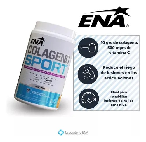 Colágeno Sport de ENA Sport es un suplemento dietario en polvo que contiene colágeno hidrolizado junto con activos como vitamina C, magnesio, cúrcuma y ácido hialurónico en cada porción. Está disponible en sabores como naranja y fruit punch, y su envase generalmente rinde unas 30 porciones.