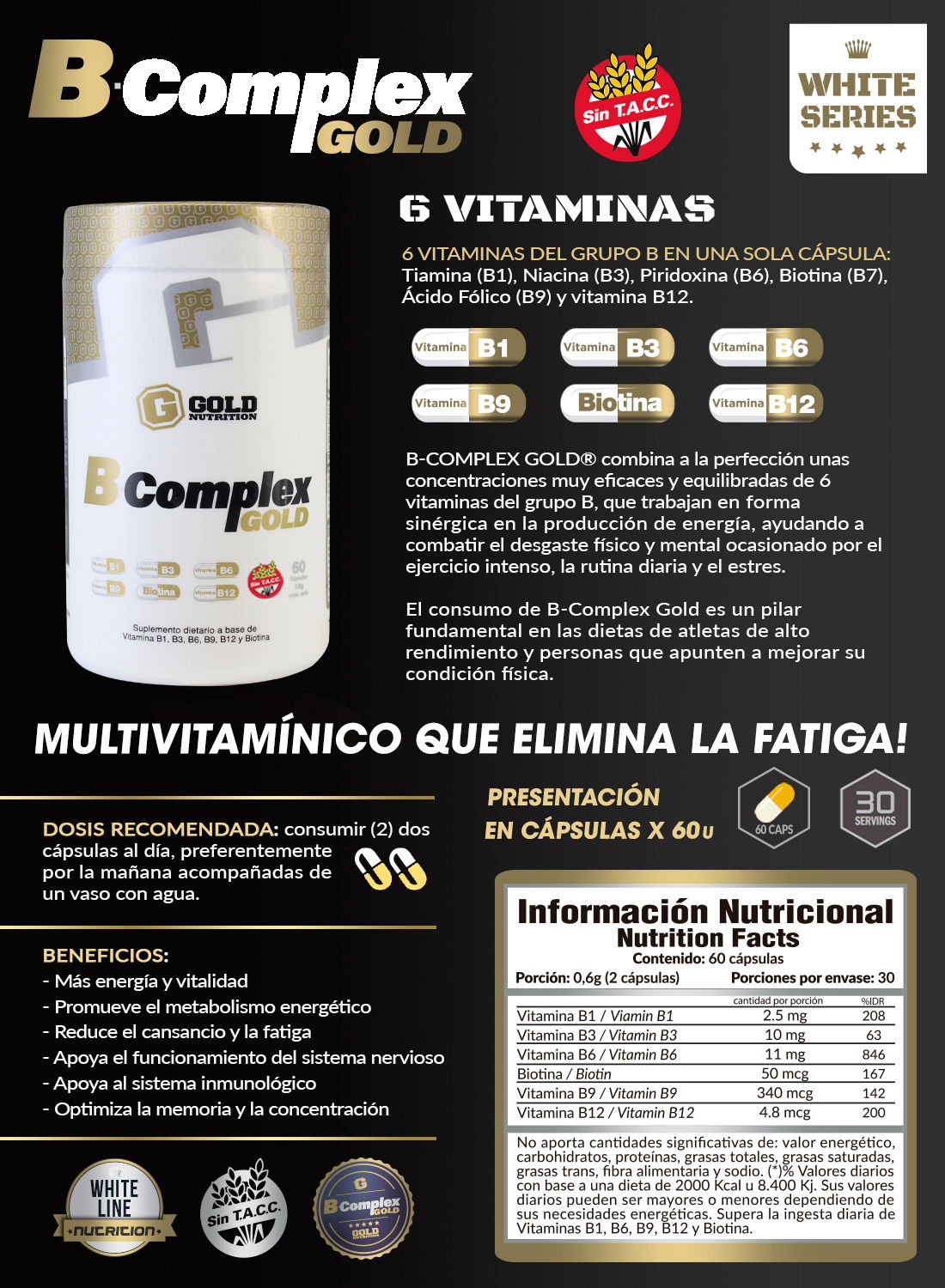 Previene déficits de vitaminas B comunes en atletas debido al esfuerzo físico y el estrés nervioso.