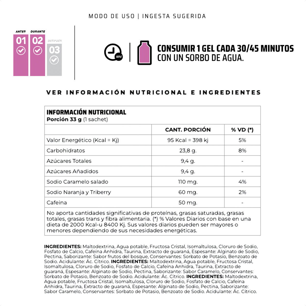 Es un concentrado energético de consistencia gelatinosa, presentado en un display de 12 sobres individuales de 40g cada uno. Su fórmula está diseñada para aportar carbohidratos de rápida absorción (Maltodextrina y Fructosa) junto con electrolitos esenciales, en un envase liviano y fácil de abrir en movimiento.
