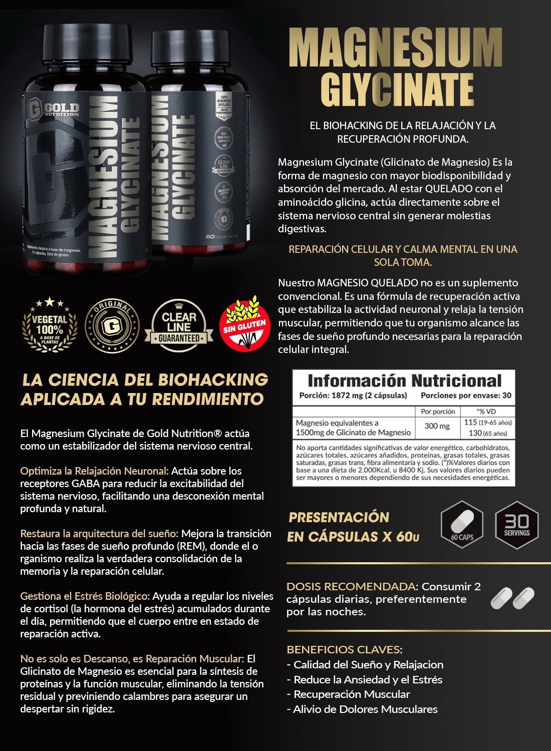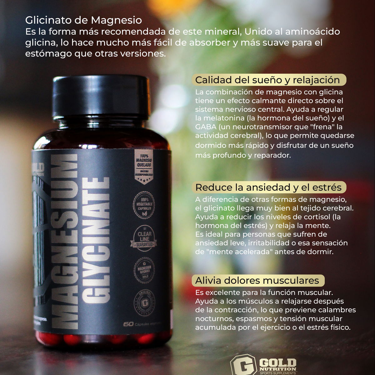 Es una combinación de magnesio unido al aminoácido glicina. A diferencia de otras versiones (como el óxido o el citrato), el glicinato es la forma "quelada" del mineral, lo que garantiza una absorción superior por parte del organismo y una excelente tolerancia gástrica (no tiene efecto laxante).