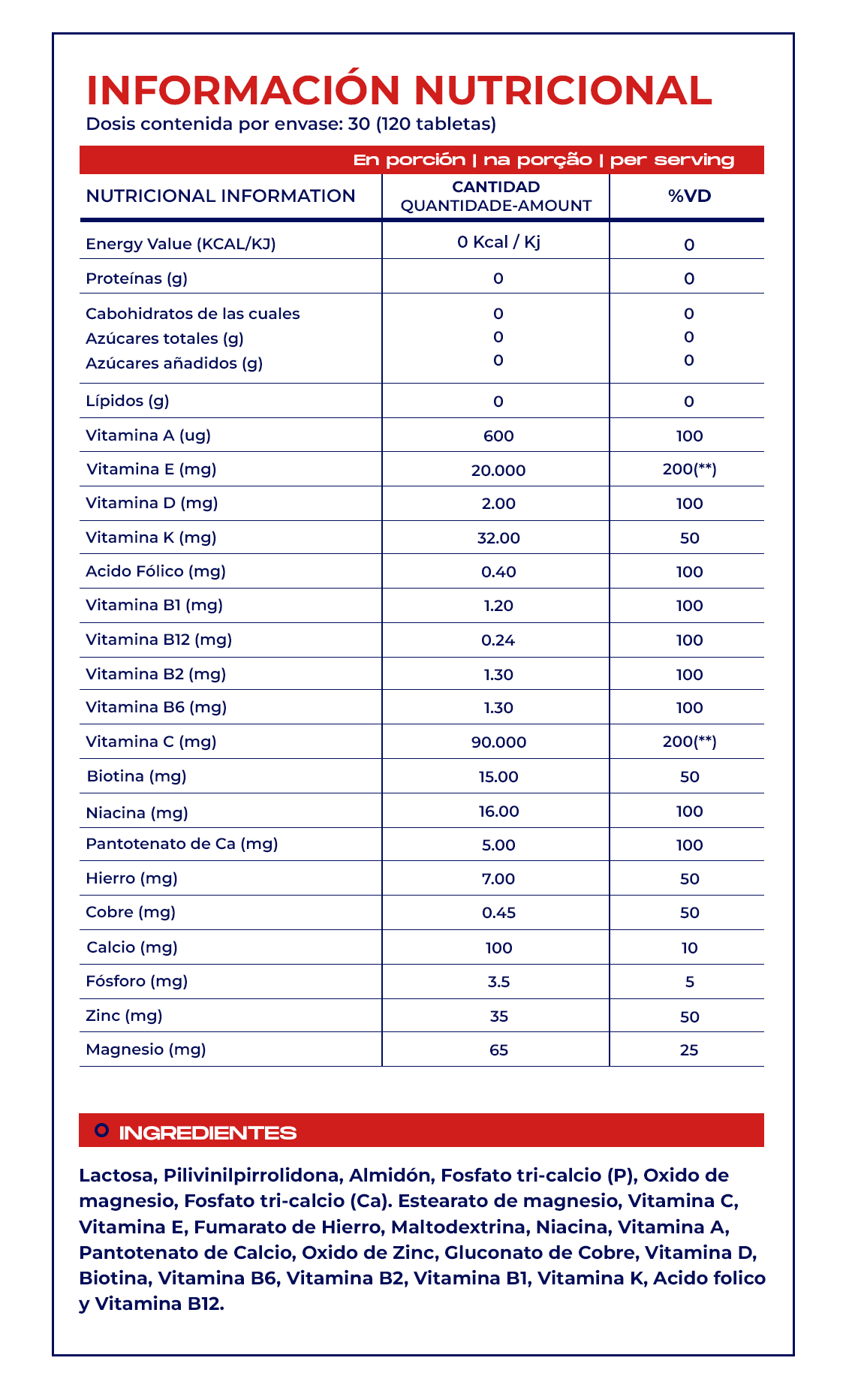 Un suplemento dietario en comprimidos que cubre el 100 % de las recomendaciones diarias de vitaminas y brinda un aporte significativo de minerales esenciales. Además, incluye una dosis extra de vitaminas antioxidantes como C y E, ideal para proteger las células del estrés oxidativo.
